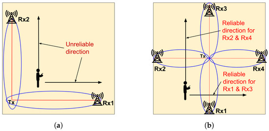 Towards Solving Unreliable Direction Problem. (a) Unreliable Direction using 2 receivers. (b) SWiLoc solves unreliable direction using 4 receivers.