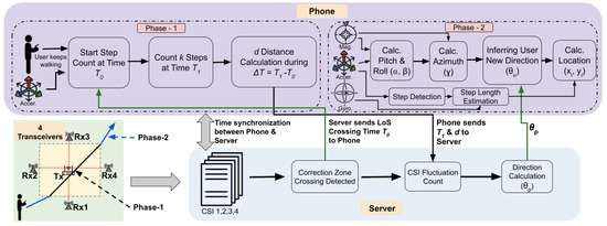 - Following CSI analysis, the server transmits to the smartphone, which continues to gather data from the motion sensor as the user walks. This data includes the user’s step count, the phone’s orientation (pitch, roll, and azimuth), and the timestamp for each step, all of which are processed and recorded by the smartphone.