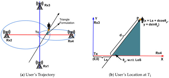 Figure 5a illustrates the method for determining the user’s direction using motion sensor data and WiFi sensing. A coordination system is established using a transmitter Tx at (0,0) and four receivers (Rx1–Rx4), with Rx4 aligning with the positive x-axis. When the user intersects the LoS between Tx and Rx4 at time , the intersection point is designated as (,0). Although the CSI analysis at the receiver detects the time of LoS crossing, the exact crossing point, , remains undetermined. The user then walks k steps to reach point P at time . As detailed in Figure 5b, the coordinates of P (user’s location at ) can be represented as: