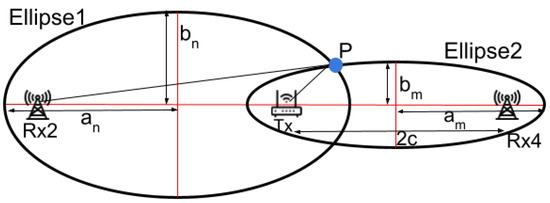 here , , and represent the major and minor axes of the nth and mth ellipses respectively (refer to Figure 6). These terms are derived from Fresnel zone theory using the values of m and n and c is half the distance between the transmitter and receiver, as established during the system setup. By substituting the x, y values from Equations (2)–(3), we can determine the user’s direction and the LoS crossing point .