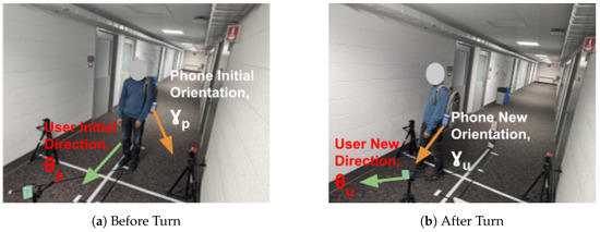 - The phone receives the user’s walking direction and maps the phone’s orientation to the user’s walking direction during and by using Equation (4).