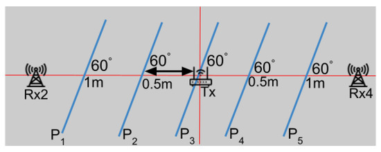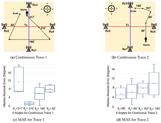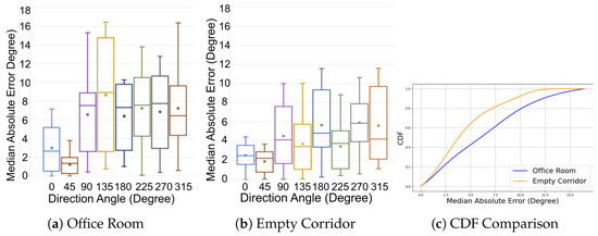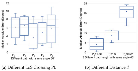 We evaluated the impact of varying LoS crossing locations on accuracy. As depicted in Figure 16, the testers traversed the LoS between Rx2 and Rx4 maintaining a consistent walking direction, but at different crossing points. These paths (, , , and ), each 3 m in length and spaced 0.5 m apart, are further analyzed in Figure 17a. The results show that the direction estimation for all paths exhibited a median error of less than 7 degrees, demonstrating that our WiFi sensing method performs well across various LoS crossing points.
