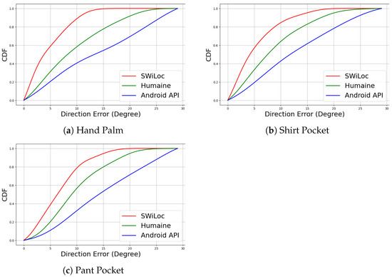 We also tested how different ways of holding the phone impacted the walking direction accuracy. Figure 14a–c shows the CDF graphs for 3 hold positions, comparing SWiLoc with two other systems, Humaine [7] and Android’s builtin compass. The CDF results show that SWiLoc achieves the best accuracy regardless of the phone holding position. These results provide evidence to support our claim that combining active smartphone-based PDR with passive WiFi-sensing-based correction zones yields greater accuracy than existing state-of-the-art systems.