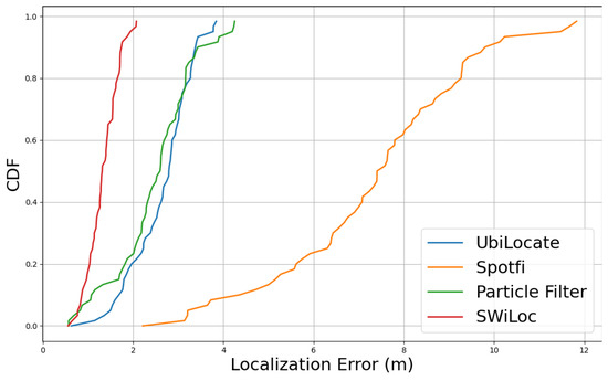 Finally, we compared our localization results with the state-of-the-arts localization approaches, shown in Table 2. Among the approaches, UbiLocate [35], Spotfi [36], Spring [37], Fusic [38] are based on passive sensing, while Kalman-filter [39], SmartPDR [24], Particle-filter based [40], LSTMLoc [41] are active fusion based. SWiLoc outperformed both the active and passive based localization approaches by achieving 1.12 m of 80-th percentile localization error. Among all the methods, we implemented UbiLocate, Spotfi and Particle Filter based methods and tested for only Trace 2 holding the phone on hand palm. Figure 15 demonstrated that SWiLoc achieved highest localization accuracy among the 3 other methods. Please note that we employed Intel 5300 NIC for implementing Spotfi and UbiLocate testbed and utilized Linux CSI tool [42] to collect and process CSI data.
