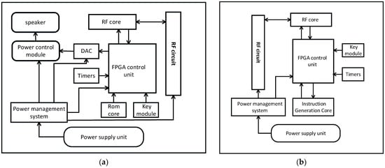 The hardware structure of the acoustic node is shown in Figure 2a. It mainly consists of a Field-Programmable Gate Array (FPGA), a Digital-to-Analog (DA) module, an RF module, and a speaker. At the same time, three IP cores are generated inside the FPGA: ROM IP, RF core, and timer, respectively. ROM IP is used to store fixed-pointed signals. The RF core is used to interact with the RF module and also interact with the FPGA control unit. The timer provides a clock to the FPGA control unit. The DA module is controlled by a clock to convert the digital audio signal into the analog signal, which directly drives the speaker. The hardware structure of the scheduler is shown in Figure 2b. The role of the scheduler is to generate wireless trigger signals for controlling the acoustic nodes. The RF core and timer in the scheduler have the same functionality as their corresponding modules in the acoustic node. The role of the instruction generation core is to generate instructions for the FPGA control unit, and the instructions are transmitted through the RF module. The key module in both the acoustic node and the scheduler has the functionality of starting or pausing the system.