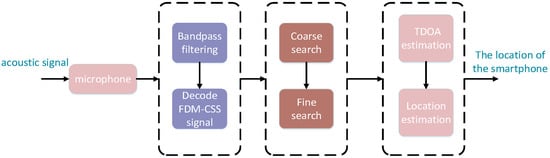Based on the above discussions, exploring robust acoustic positioning systems still has its significance in both academia and industrial fields. In this work, a RATBILS system is developed, which only requires users to carry mobile phones for direct positioning without the need for additional auxiliary devices. Due to detrimental factors such as high levels of noise, echoes, multipath propagation, and the doppler effect in indoor acoustic channels, the quality of the transmitted signal is reduced, limiting the communication range and resulting in errors in demodulation. Traditional digital modulation techniques for wireless communication, such as amplitude, and phase modulation, are not directly suitable for our system. Additionally, it is worth noting that acoustic waves experience considerably higher attenuation (i.e., decrease in signal strength with distance) compared with electromagnetic waves of similar frequencies, resulting in low-amplitude received signals and limiting the operating range of the system. As stated in article [], the achievement was limited to acoustic communication within a range of 0.7 m. In the fields of underwater acoustic communication [,,] and wireless communication [,,], chirp spread spectrum (CSS) techniques are recognized as highly efficient information transmission schemes. In CSS transmission schemes, the receiver employs matched filtering (MF) to optimize the signal-to-noise ratio (SNR), resulting in an extended communication range. Furthermore, these techniques exhibit exceptional effectiveness in dealing with low-amplitude received signals, interference, and selective fading. Based on CSS, we have developed the FDM-CSS solution, which balances positioning performance and coding effectiveness.