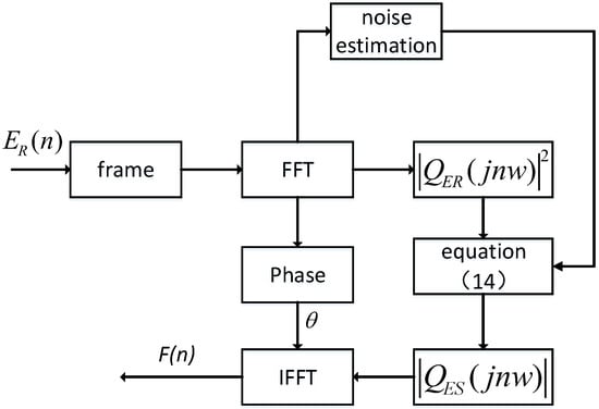 where represents the Inverse Fast Fourier Transform, represents the frequency domain magnitude, represents the phase of , and represents the time domain signal. Figure 7 is the overall flowchart of spectral subtraction, as shown in the following figure: