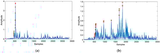 Multiple threshold extracting results in different conditions (a) Multiple threshold extracting results within LOS condition (red asterisk represents ); (b) Multiple threshold extracting results within NLOS condition (red asterisk represents ).