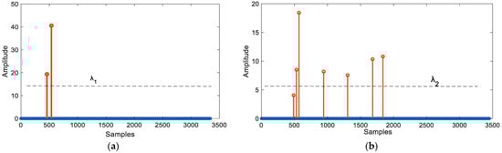 Step 1: Multiple threshold grouping. In article [], the author proposes that the use of a multi-threshold method can yield peaks at different time indices and categorize these peaks into different groups. However, the author incorporates all potential first paths of each group into the localization process, which increases the complexity of localization. Additionally, the article also points out that if the signal is strongly influenced by reverberation, the number of groups will be greater. In article [], the author utilizes the formula to reflect the width of the main lobe after MF ( represents the sampling rate, B represents the bandwidth of the signal), which reflects the aggregation of MF output results in ideal conditions. Combining the two facts, we have developed a multi-threshold grouping method. First, we set a range for the threshold in Equation (16), . By gradually increasing from to 1 with a fixed step size , we can obtain a time series called , where n = 1, 2, …, . In other words, is a discrete time series related to TOA estimation. Due to the effects of multipath and human body obstruction, the received signal exhibits certain clustering characteristics after MF processing, as shown in Figure 10. If peaks gather together, we consider them to belong to the same group. Subsequently, as shown in Equation (17), we can derive a time difference sequence , which captures the time interval between consecutive time indices of .