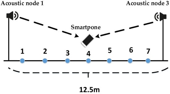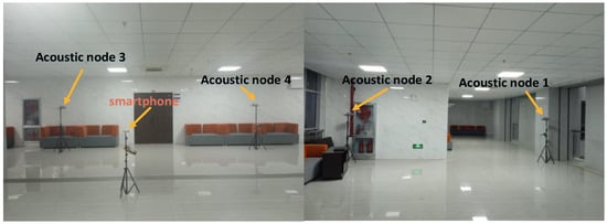 - Large-scene smartphone positioning: Our acoustic nodes are easy to deploy, and we have the ability to achieve positioning in large indoor spaces. However, there is a problem of the near–far effect in large indoor spaces. We plan to overcome this problem by increasing the length of the localization source signal and using the dereverberation processing.