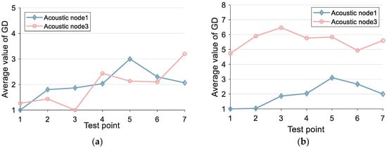 Figure 16 corresponds to the schematic diagram of scene 1. In scene 1, we performed data collection at a total of 13 test points. These 13 testing points were further categorized into two distinct regions, namely region 1 and region 2. It is evident that the acoustic signal in region 2 is significantly affected by more pronounced obstruction and multipath effects, primarily due to the closer proximity of the testing point to the wall. We collected data 50 times at each test point, and there were human occlusion conditions during each data collection process. To compare the accuracy of different TDOA detection algorithms, we first performed RDOA measurements on the test points in region 1 of scene 1. The average RDOA measurement error was then used to evaluate the performance of different detection algorithms.