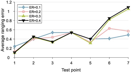According to Figure 15, we can observe that the RDOA measurement error is relatively small when the ER is set to 0.1 or 0.2. At the same time, we also found that when ER is set to 0.3 or 0.4, the measurement error of RDOA from test point 1 to test point 5 is relatively small, while the measurement error of RDOA is particularly large at test points 6 and 7. To ensure the robustness of RDOA measurements, we set the ER to 0.2 in the experiments.