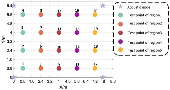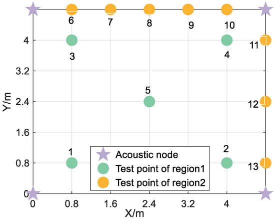 Distribution of acoustic nodes and test points in experiment scene 2.