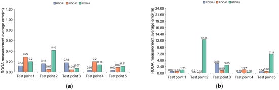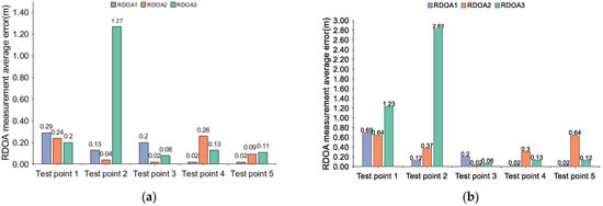 Average measurement error of RDOA in region 1 of scene 1: (a) RDOA measurement average error in region 1 (using MF-0.2 method); (b) RDOA measurement average error in region 1 (using MF-0.3 method).