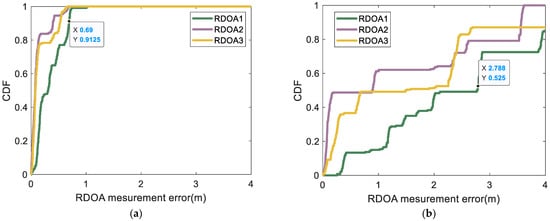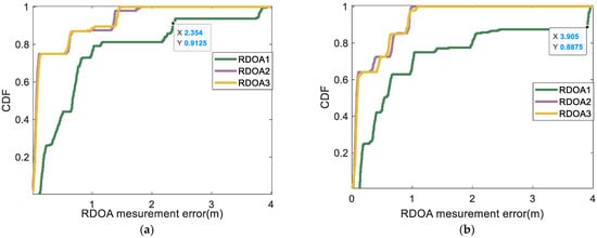 CDF of the RDOA measurement errors in region 2 of scene 1: (a) CDF of the RDOA measurement errors in region 2 (using proposed method); (b) CDF of the RDOA measurement errors in region 2 (using MF-max method).