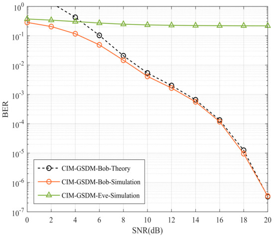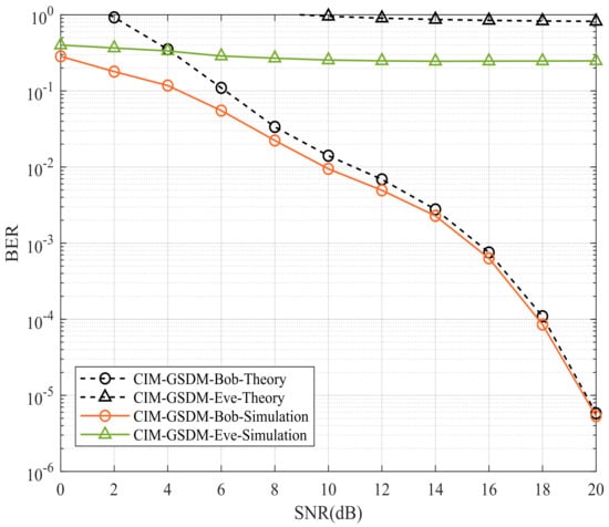 Bob and Eve’s BER performances of proposed CIM-GSDM scheme employing , , and QPSK.