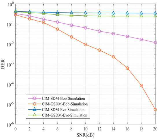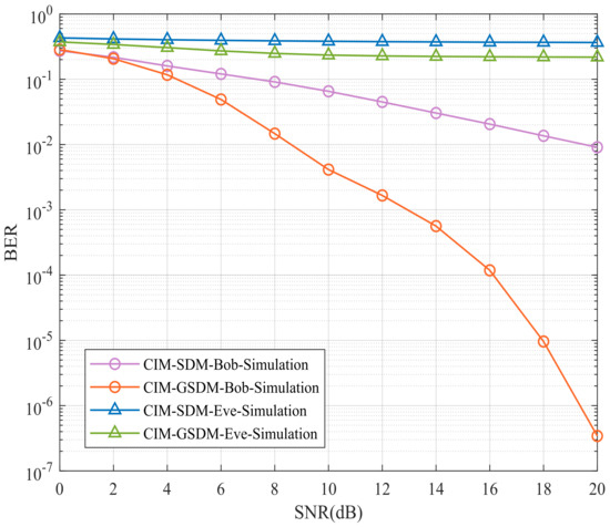 Figure 4 suggests Bob’s and Eve’s BER performances of proposed CIM-GSDM scheme in comparison to the traditional CIM-SDM counterparts employing , , and QPSK at the same spectral efficiency. Specifically, the BER performance of Eve suffers great interference at both the CIM-SDM and CIM-GSDM scheme, which implies these two scheme can improve the security as it needs. Apart from this, another advantage ensured is the BER performance of Bob has much development in the proposed scheme than that of the original CIM-SDM scheme with nearly 10 dB gains. Therefore, the proposed CIM-GSDM system provides more enhancement than the conventional CIM-SDM system in terms of security of transmission.