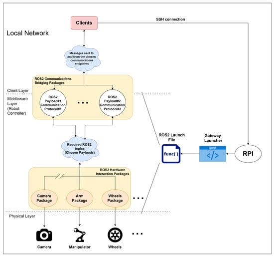 As previously mentioned, this solution aims to ensure a fast and agnostic integration of robots into any kind of technological environment, while enabling the modular usage of the robots’ payloads on-demand. It should be noted that there are numerous communication protocols in use, with new ones emerging frequently. In light of this, the approach taken with this solution was to enable interoperability with the most commonly used technologies, with the flexibility to add further ones in the future. We hope that Figure 1 will help the reader to understand the general workflow of the developed solution. The process begins with the user accessing the robot’s platform via a Secure Shell (SSH) connection and initiating the gateway’s launcher script. Once the configuration has been provisioned, the user is free to proceed without further action. The gateway is responsible for launching the required ROS2 packages regarding the required payloads and communication technologies, and for ensuring everything is configured according to the data provided by the user. Once this process is complete, the user will be provided with all the required endpoints and connection information, allowing he/she to start using the robot for whatever purpose they require. It might be helpful to clarify that once the robot is up and running, it is not configured to perform any kind of task. The objective here is to enable external access and control of each payload so that users may program them according to their needs in a modular and high-level way using the technologies they are already proficient in.