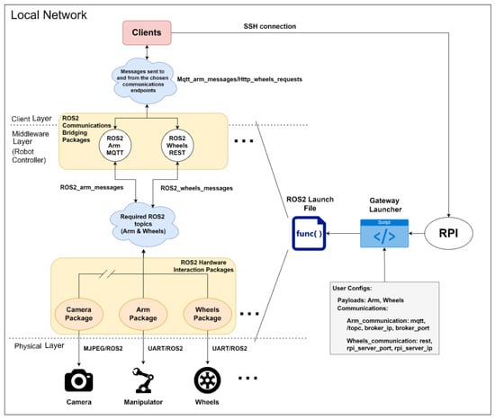Once the issues had been identified and solutions found, it was time to consider how the gateway could be brought to life through the design of a well-structured architecture. After considering a number of possibilities, it became clear that the architecture should be designed to accommodate a wide range of use cases and be sufficiently straightforward to be easily replicated. As a result, the components were divided into the logical layers that had been previously mentioned, which helped to simplify the mental representation of each stage of the workflow. Please refer to Figure 3 for a representation of the whole architecture as a use case, which illustrates how the gateway behaves from the bottom to the top when users/programmers decide to bring up certain payloads. In this particular instance, the diagram illustrates how the components work when the user elects to utilise both the arm and wheels payloads concurrently.
