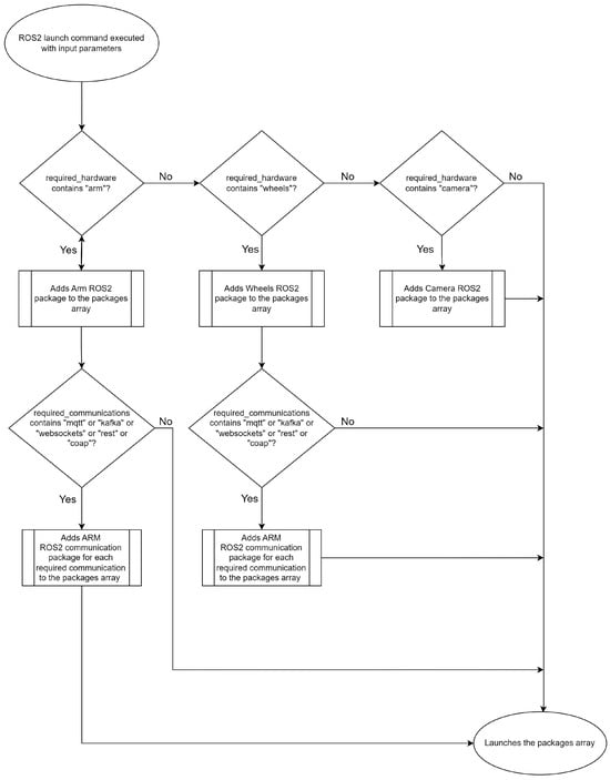 As an example, when a user executes the initial user interface and chooses what payloads and communication technologies he/she intends to use, the UI shell script runs the ROS2 launch command to process the launch file. The launch file’s logic is prepared to take into account two arrays: one array containing the target payloads and another array containing the intended communication technologies. The program then checks, for each inserted payload name, whether there is an available ROS2 payload package mapped to that name. If there is a corresponding payload package, the program then loops through the inserted communication technologies’ names array and attempts to ascertain whether there is an ROS2 communication package available for that payload that is mapped to that given communication technology name. If a match is found, the program adds the respective package and its parameters (inserted by the user and mapped to code placeholders in the parameters property of the package) to the node’s array. Once the arrays have been looped, the program executes the resulting nodes array.