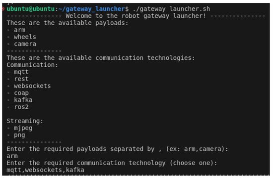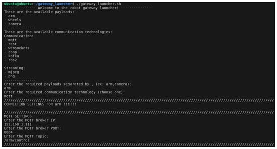 This is a straightforward user interface component that aims to facilitate the use of the gateway by users. Its primary objective is to request information from the user, such as the necessary payloads and communication protocols. For each selected communication protocol, it then requests connection settings. Subsequently, the “ros2 launch” command is executed in order to call the launch file, with the user data passed as parameters. Finally, once everything is operational, it provides all the necessary information for the user to understand how to access and use the gateway, taking into account the selected options and the provided connection details.