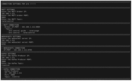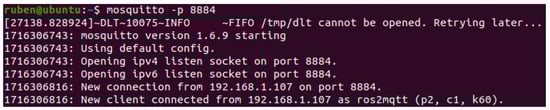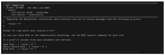 In this test, we explored the potential of using a robotic arm as the payload and MQTT as the communication protocol. The first step was for the user to start up the MQTT broker, which was running on an Ubuntu 20.04 virtual machine. The user then proceeded to establish a connection to the robot’s Raspberry Pi device via SSH. The next step was to initiate the UI script, as illustrated in Figure 6, and select the arm payload and the MQTT communication technology. The script kindly requested the messaging broker’s IP and port, as well as a name for the required MQTT topic. Once this process was complete, the launch file was initiated, which enabled everything to be put into operation. It was then possible to check in the messaging broker’s logs that a new client had connected (Figure 7).