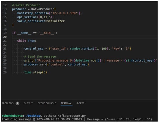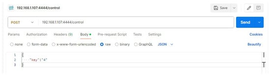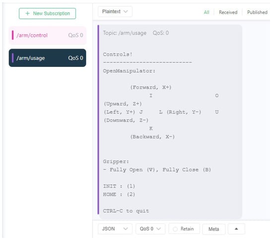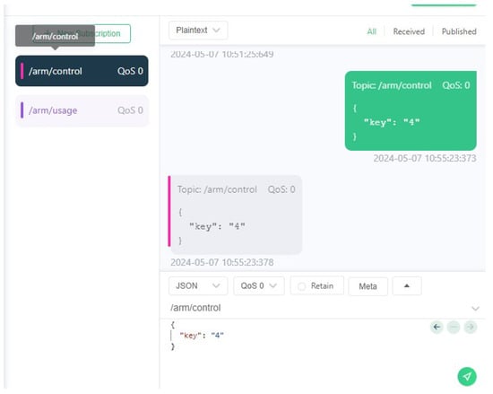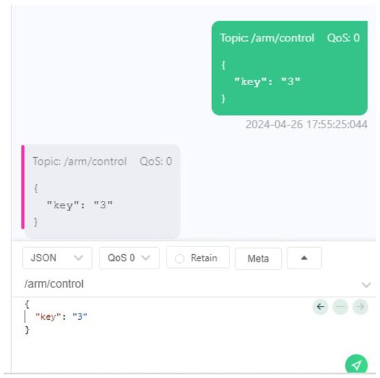 A software called MQTTX, which is a simple MQTT client running on the user’s local machine, was used to establish a connection to the same messaging broker. Then, with the assistance of the UI script (Figure 8), the user was able to initiate the publication of control messages (see Figure 9) to the newly created MQTT topic, which resulted in the desired movement of the robotic arm. For the purposes of this test case, the ROS2 arm payload package also published control guidelines through an MQTT topic, as can be seen in Figure 10.