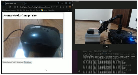- Purpose: This test case aims to observe and touch an object. To this end, a web interface was created that allows the user to visualise the images acquired by a real sense camera attached to the robot arm as well as to manipulate the arm in order to reach the object. In this use case, websockets were used for the interaction between the user and the robot.
