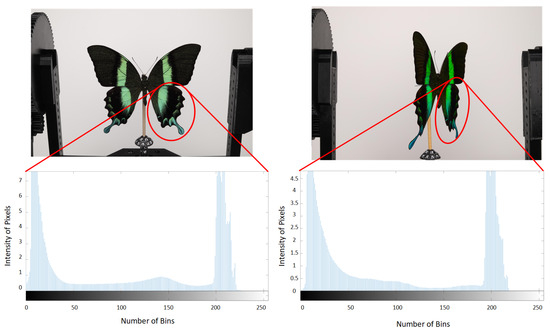 A histogram is presented for more effective interpretation (the color image has been converted to grayscale as is shown in Figure 2) Converting the color image to grayscale allows for a clearer analysis of the intensity and distribution of light across the wing surface, independent of color variations. This method simplifies the identification of patterns and features by focusing on luminance contrast rather than chromatic information. The observed phenomenon of color transformation can pose significant challenges in aligning and extracting local features from images. As the butterfly’s wings tilt and rotate, the shifting iridescence can cause inconsistencies in feature detection algorithms. These algorithms rely on stable and distinct visual landmarks to accurately map and align images. However, the dynamic color changes can cause these landmarks to become misaligned, complicating the image processing workflow. These challenges become apparent in subsequent processing steps. The color change due to iridescence can cause traditional feature extraction methods, which often rely on consistent color or intensity patterns, to fail or produce errors. Advanced image processing techniques, such as robust feature matching algorithms and adaptive alignment methods, are required to mitigate these effects. In addition, the incorporation of multi-angle imaging and photometric stereo techniques can help capture the full range of color transformations, providing a more comprehensive dataset for analysis. Understanding the behavior of Papilio blumei wing coloration under different viewing angles is critical for accurate macro-photogrammetry. By overcoming the challenges posed by iridescence, researchers can improve the accuracy and reliability of 3D models and other analytical results derived from the images used in different visible wavelengths of light. This understanding not only improves the technical aspects of image processing but also contributes to the broader field of optical and structural studies in biological specimens.
