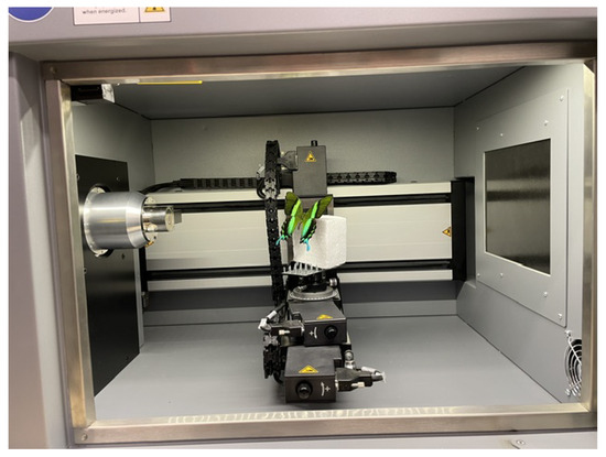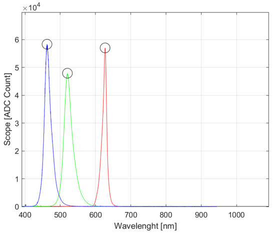 Modifying the spectral characteristics of the light source enables the implementation of alternative processes and sensing options, which in turn extends the time required for the creation of the dataset in comparison to the standard method. This approach offers a novel method for enhancing the photogrammetric procedure, which is currently being investigated in various forms [18,19,20]. To ascertain the spectral characteristics of the lighting apparatus utilized (Figure 5a), the Avaspec-3648 spectrometer (Avantes, Apeldoorn, The Netherlands) was employed for precise measurement (Figure 5b). White light encompasses all wavelengths, but by dividing it into its constituent basic wavelengths (red, green, and blue) for subsequent image data preprocessing, more data were obtained. The measuring probe (Figure 5a) was positioned in front of the light source (Figure 6), and the room was rendered completely dark to ensure that the measurement values were not influenced by ambient light.