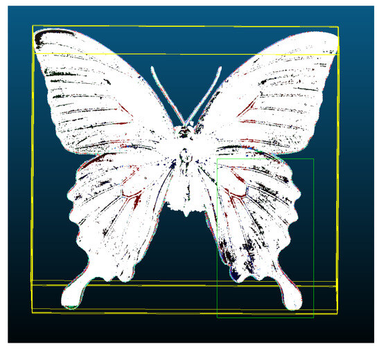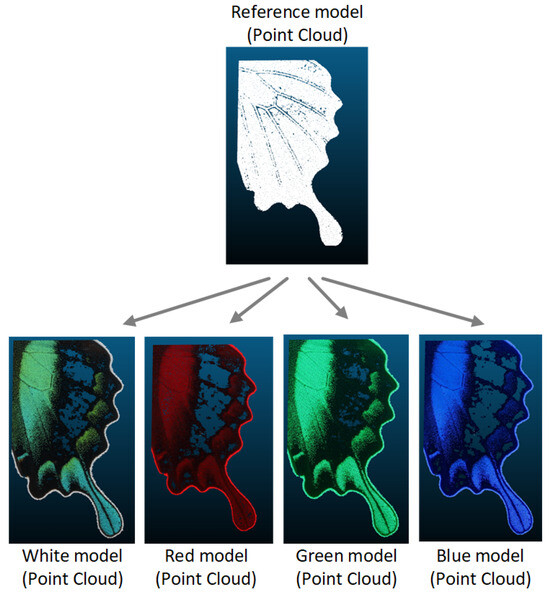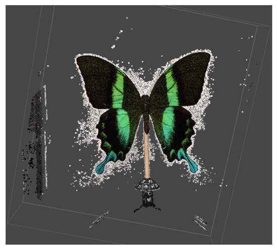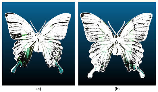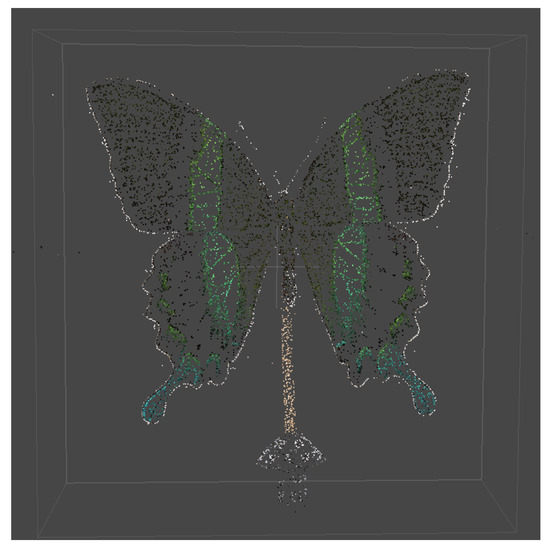 In this work, four datasets were created (each containing 100 images). These datasets were designed to capture comprehensive visual information about the butterfly Papilio blumei from multiple angles and lighting conditions, providing a robust basis for 3D modeling. The initial dataset was created using white light, with the object positioned on a sensing platform as illustrated in Figure 8. The use of white light ensured that the full spectrum of visible light was evenly distributed over the object, providing a neutral baseline for capturing the butterfly’s true colors and structural details. This was essential for accurately documenting the iridescent properties of the butterfly’s wings, which can exhibit dramatic color shifts under different lighting conditions. The number of frames per position, the rotation angle, and the number of view planes to ensure comprehensive coverage of the object were specified (Table 3). These parameters are critical to achieving a detailed and accurate 3D reconstruction.