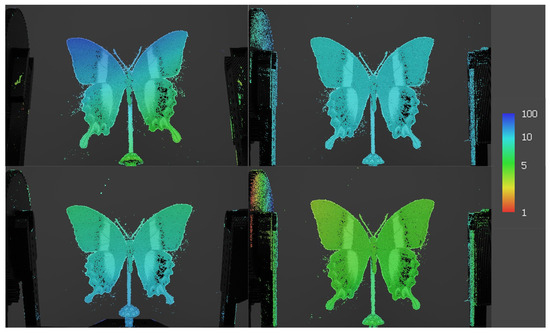 Based on the achieved results (Table 9 and Figure 20), we would like to emphasize that using discrete spectral lighting (white, red, green, and blue) enabled more precise spectral data collection, allowing for enhanced capture of fine surface details and subtle variations that standard RGB imaging may not fully capture. RGB cameras rely on the Bayer filter, which averages the response across broader spectral bands, potentially losing critical information in areas where reflectivity or surface characteristics vary in specific wavelengths. By employing individual colored light sources, our methodology provided additional spectral information, capturing more precise variations in reflectivity across the spectrum. This enhanced the depth and quality of the 3D model, particularly for objects with complex material compositions or iridescent surfaces, such as the butterfly model used in our experiments. Using illumination with discrete white, red, green, and blue (WRGB) light over traditional RGB imaging offered several advantages:
