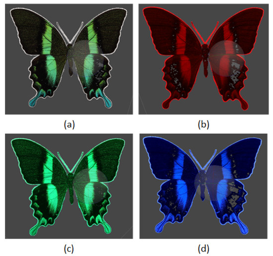 RGB lighting was used to provide consistent and adjustable illumination that enhanced the visibility of the butterfly’s iridescent colors. The RGB lights could be tuned to different wavelengths to highlight specific features and reduce color casting, ensuring that the true colors of the butterfly were captured accurately. The geometric positioning of the lights was carefully arranged to eliminate shadows and provide even lighting across the entire surface of the butterfly, as depicted in Figure 7. This setup helped to reveal the intricate details of the wing scales and patterns without introducing glare or reflections.