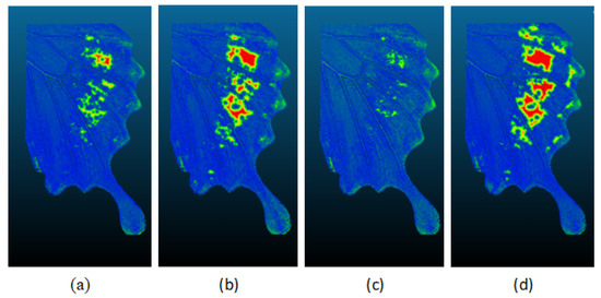 The Cloud Compare program determined the optimal maximum distance between the point clouds, as shown in Table 9. It then adjusted the predefined distance values, expressed in millimeters, to a uniform value representing a maximum distance of one millimeter. The visualizations for each comparison are shown in Figure 20. In each comparison, it is possible to see which point cloud had the highest degree of error. The point cloud shown in blue had the highest error rate for missing points within the region of interest (Figure 20d). This deficiency could be attributed to the fact that under blue light, black regions could not be effectively registered by the algorithms, in contrast to their performance under other wavelengths of light. In the previous section, the absolute distance between the point clouds in advance was calculated. To ensure consistency in the results of subsequent comparisons, a distance with a maximum value of 1 mm was used (Table 9).