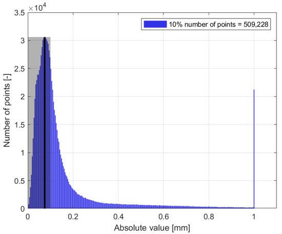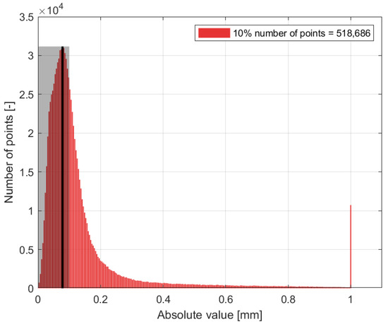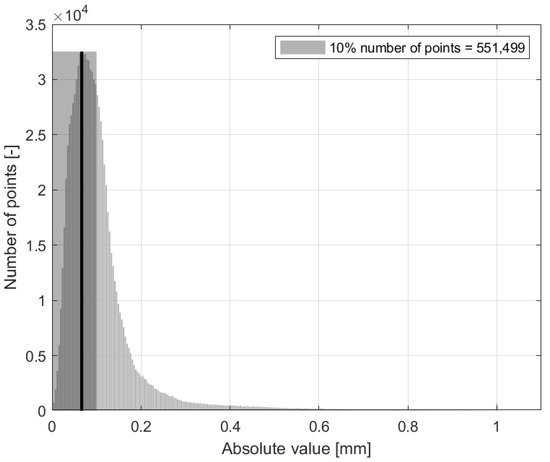 In the case of the compared region, which contained 978,291 points, the majority of the distances were less than 1 mm, with the majority of these distances ranging from 0 to 0.2 mm. However, in the blue dataset (Figure 20d), red areas indicating distances greater than 1 mm were observed (Figure 21). A comparison of the red dataset, as shown in Figure 22, showed a reduction in the error rate compared to the previous dataset (Figure 21). The majority of the points under comparison had a relatively small distance between them, with this distance decreasing rapidly as the distance between them increased. At a distance of 1 mm, a sharp increase with 10,000 distant points was observed. This discrepancy is clearly seen in Figure 20b. By plotting the absolute distance for the white dataset (Figure 20a) and comparing it to the previous blue (Figure 20d) and red (Figure 20b) datasets, it is observed that the white dataset had smaller distances (Figure 23). The process of creating such a point cloud was appropriate for the integrity and representation of the 3D model. As shown in Figure 20a, the discrepancy is visible in regions where the generated 3D model had less inaccuracy.