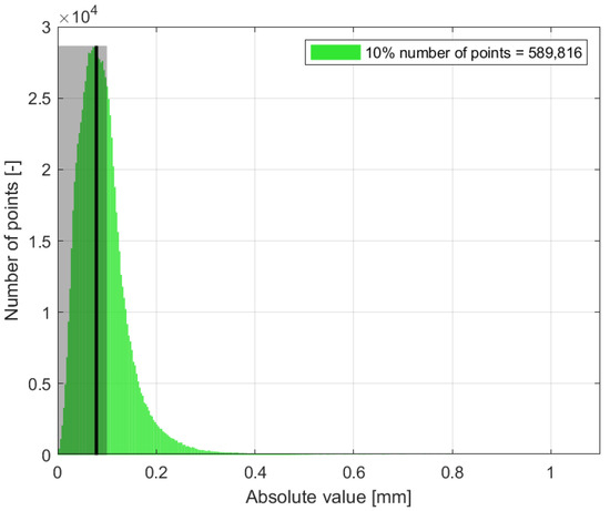 The final comparison of the absolute distance for the green dataset is represented in Figure 24. It is evident that the distance in the green point cloud decreased and was approaching near-zero values. This discrepancy is evident in the region of interest depicted in Figure 20c). This phenomenon is attributed to the object’s surface, where the green wavelength is in close alignment with the surface structure. For such colored surfaces, green visible light provides a superior option for digitizing this specific surface. The digitization of such surfaces and the utilization of the visible spectrum can effectively eliminate deficiencies caused by surface reflectivity. Future applications of varying wavelengths may yield more optimal results by implementing additional wavelengths beyond the visible light spectrum in digitization applications.