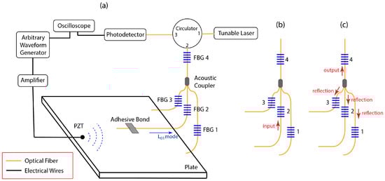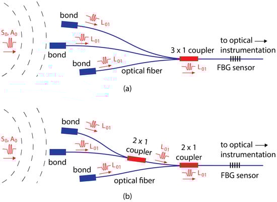 Coupling of three Lamb wave signals into a single FBG detector through (a) one 3 × 1 coupler and (b) two 2 × 1 couplers. Ultrasonic waves shown in red.