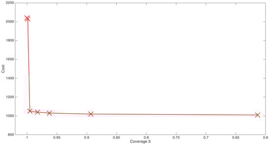 The cost function identified was the coverage with three AS pairs. The Pareto front (Figure 6) presents the optimal coverage achieved for different costs of the AS network.
