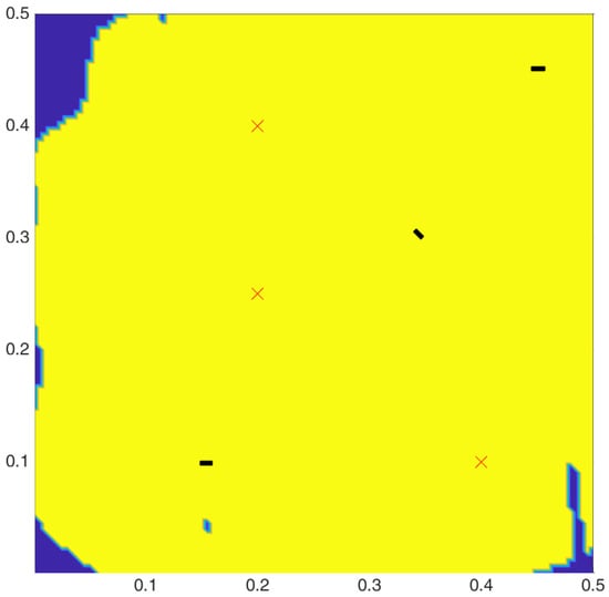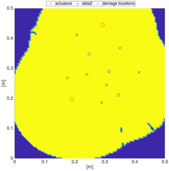 Coverage for the AS network (yellow shows covered areas, ‘o’ are the actuators, ‘rectangles’ are sensors, ‘x’ are the damage locations simulated).