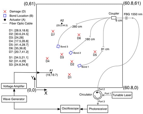 - Soman, R.; Kim, J.; Aiton, S.; Peters, K. Guided waves based damage localization using acoustically coupled optical fibers and a single fiber Bragg grating sensor. Measurement 2022, 203, 111985. [Google Scholar] [CrossRef]