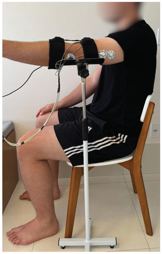 Next, the skin was cleaned with alcohol and cotton at the sites where the disposable electrodes would be applied. The electrogoniometer was then positioned on the subject’s arm, centered with the elbow joint. After this, the resting signal was collected for 10 s. Then, data collection for the Maximum Voluntary Contraction (MVC) began, involving three repetitions for each muscle, each lasting 5 s with a 30 s rest period between contractions. In the final stage, the participants performed active movements, executing full elbow extensions and flexions at a comfortable pace. Each individual completed 15 repetitions of this exercise.