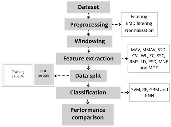 Flowchart of the proposed signal processing. Firstly, the sEMG signals are preprocessed. Then, the windowing and feature extraction are performed on the preprocessed data. Finally, the performance of the four classification models (RF, KNN, SVM and GBM) is verified using 10-fold cross-validation.