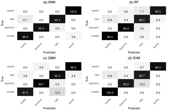 In this analysis, the models that stand out are KNN and SVM, with KNN being the best in all classes. KNN presented an accuracy of 96.4% for healthy, 95.0% for hypotonic, 93.3% for rigid and 100% for spastic individuals. The KNN model successfully classified all spastic individuals but had its worst performance with rigid individuals. The model’s biggest confusion was related to rigid individuals being incorrectly classified as healthy (6.7%). The SVM model achieved 100% accuracy for the healthy group and also showed the lowest accuracy for the rigid individuals class (89.7%). The model with the lowest accuracy of all was RF for rigid individuals (86.2%).