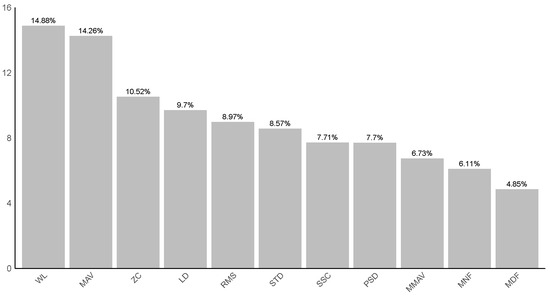 In addition to evaluating the performance of the analyzed classifiers, we also assessed the importance of the features extracted from the sEMG signal. The feature importance ratio is the sum of the two muscles of each feature, and the results are presented as percentages in Figure 4.