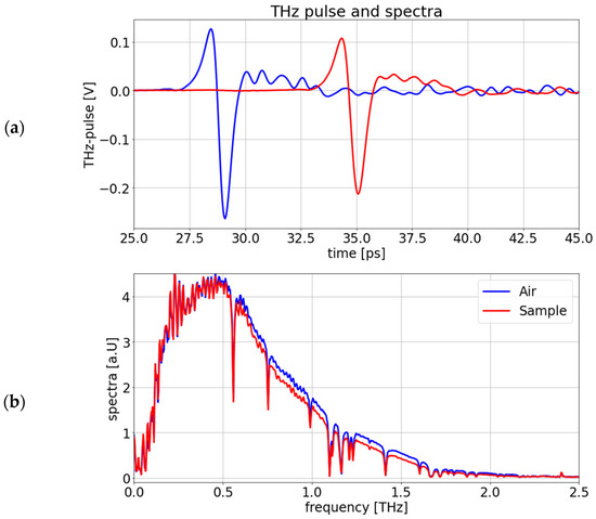 (a) THz pulse measured in air as reference (blue) and through an HDPE sample (red) in transmission with a spot size of 1 cm. (b) The fast Fourier-transformed THz spectra of the air reference pulse (blue) and the sample pulse (red).