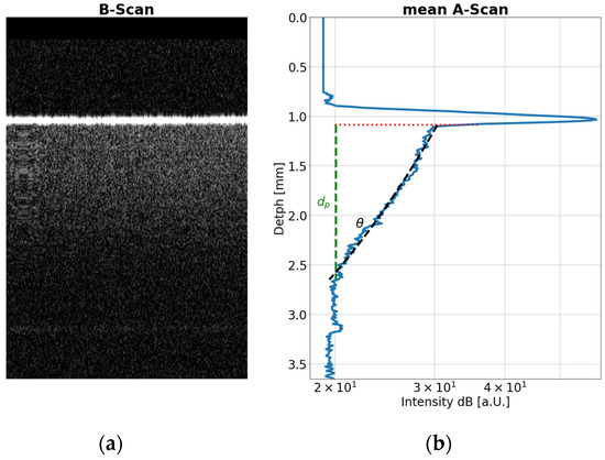 For this study, the cross-sectional images (B-scans) of the centre of the samples were observed during the tensile testing. An important result of these measurements was the determination of the thickness change, which is needed in the multimodal data analysis in combination with THz sensing to calculate the refractive index change. Another necessary step is the characterization of the scattering layer thickness (dp) and the decay coefficient (θ) in the media from the mean depth profile (A-scan), as shown in Figure 2 [25,35].