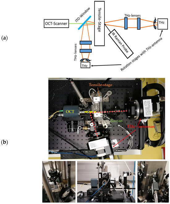 (a) Schematic drawing of the multimodal experimental setup. The OCT laser beam is through an ITO (indium tin oxide glass) window focused on the sample from the left side. The Raman setup is measured from the right side. Also, the THz radiation is focused from the left side of the sample and deflected at the ITO window to the THz antenna. (b) Photo of the multimodal experimental setup, containing Raman, OCT and THz configuration, from different viewpoints.