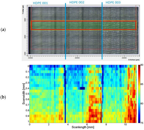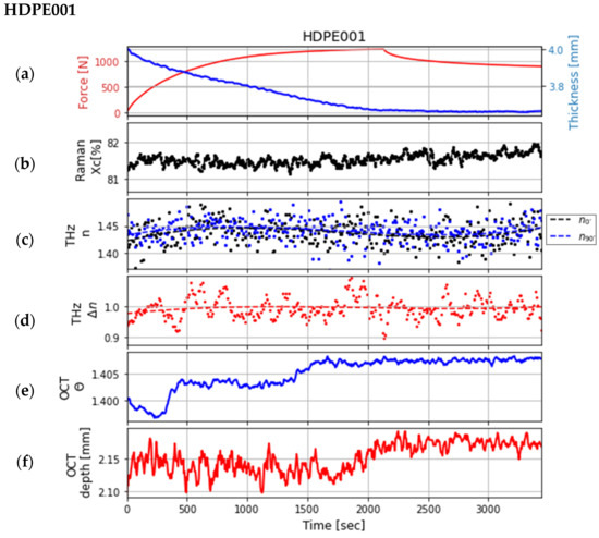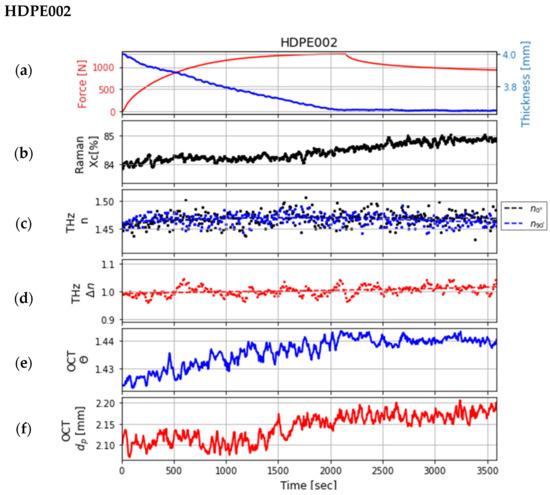 In Figure 8, the graphs of the sample HDPE001 are depicted. The graphs illustrate the changes during the tensile test; only a very slight oscillation can be seen in the change in crystallinity at the sample’s surface determined from the Raman data. However, at the end of the tensile tests, the surface crystallinity is slightly higher than at the beginning. A slight oscillation is also visible in the change in THz refractive indices and birefringence after smoothing the data. This variation remains however within the noise of the measurement. The extracted features from the OCT data show significant variations. The impact of the tensile test on the crystallinity and the extracted features of the sample is thus low but visible in the Raman and OCT data.