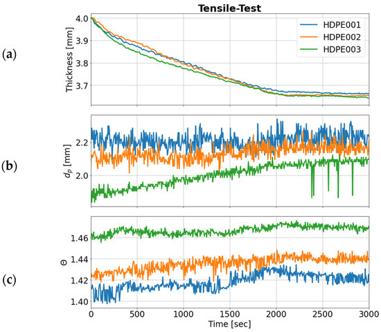 Comparison of the features extracted by OCT imaging over time: change in (a) the thickness, (b) penetration depth, and (c) scattering coefficient of decay of the OCT mean A-scans of HDPE samples (HDPE001—blue line, HDPE002—orange line, HDPE003—green line) during the tensile test.