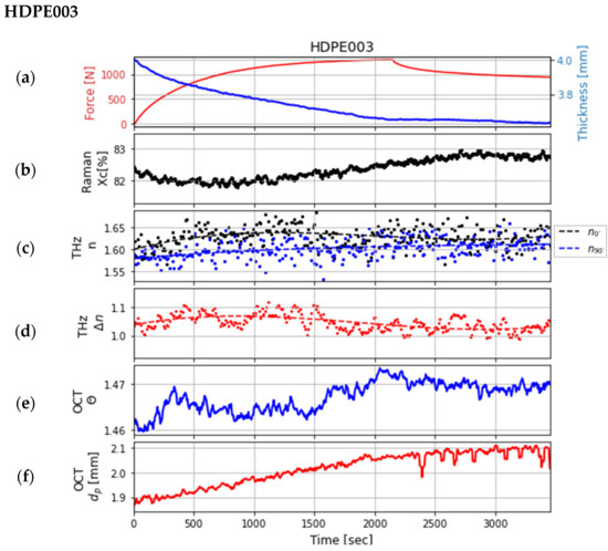 The tensile test results for the sample HDPE003 are illustrated in the graphs of Figure 10. It appears that the crystallinity from the Raman data is lower than for HDPE002. This is due, as previously mentioned, to the sample HDPE003 being inadvertently placed the other way round (i.e., with the side of lowest crystallinity toward the Raman sensor). Overall, the crystallinity from the Raman measurement increases slightly during the test. This change in crystallinity is visible and is inversely reflected in the altered THz refractive indices and their change in birefringence. The penetration depth varies much more over time than in the case of the other two samples with lower crystallinity. The scattering decay parameter determined from the OCT data is also much higher, but the change over time during tensile testing is similar.